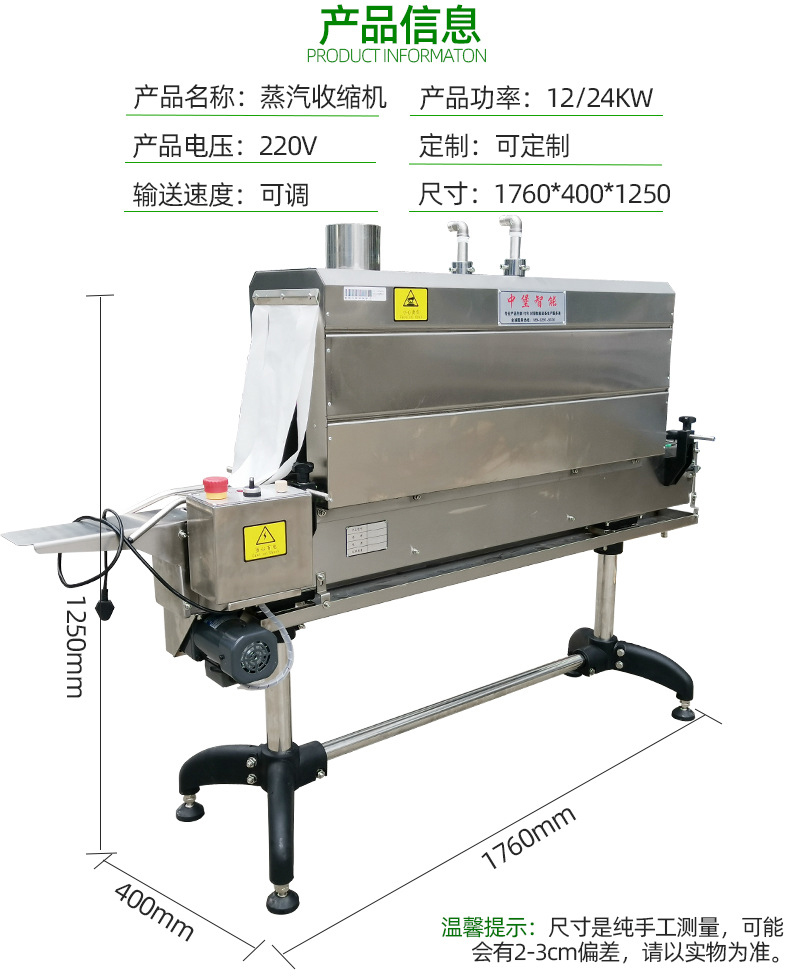 • 可以用于多種包裝薄膜的收縮,如 PVC(聚氯乙烯)、POF(聚烯烴收縮膜)、PET(聚對苯二甲酸乙二醇酯)等。這些薄膜在不同的行業中有廣泛的應用,蒸汽收縮機都能夠很好地適應。同時,它對于各種形狀和尺寸的產品也能有效收縮,無論是小型的化妝品、食品,還是大型的家電、家具等產品的包裝,都可以使用蒸汽收縮機進行收縮包裝。