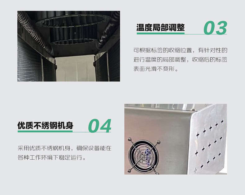 - 貼合緊密:通過精確控制溫度和輸送帶速度,能夠使標簽膜緊密地貼合在產品表面,即使是形狀不規則的產品,也能保證標簽膜與產品輪廓完美貼合,提高產品的外觀質量和標簽的牢固性。