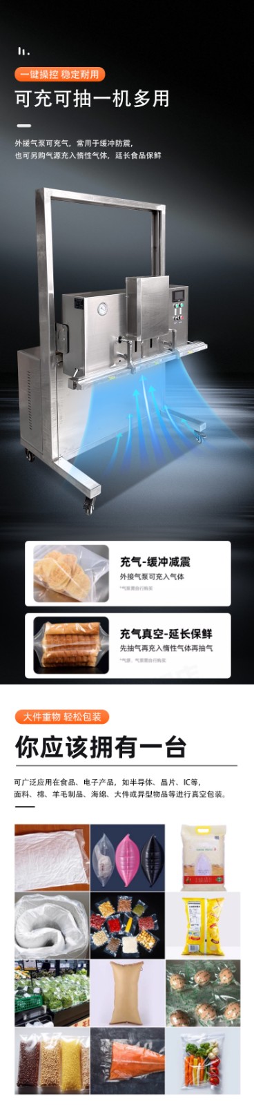 可定制與多模式適配不同尺寸:部分機(jī)型支持封口規(guī)格定制,封口長度可達(dá)到 800mm、1000mm 甚至 1200mm 等,適配不同寬度的包裝袋。同時(shí),部分先進(jìn)機(jī)型預(yù)設(shè)多組工作模式,可快速切換真空、充氣、封口等流程,適配從小袋糕點(diǎn)到大袋五金模具等不同尺寸、類型產(chǎn)品的包裝需求。
