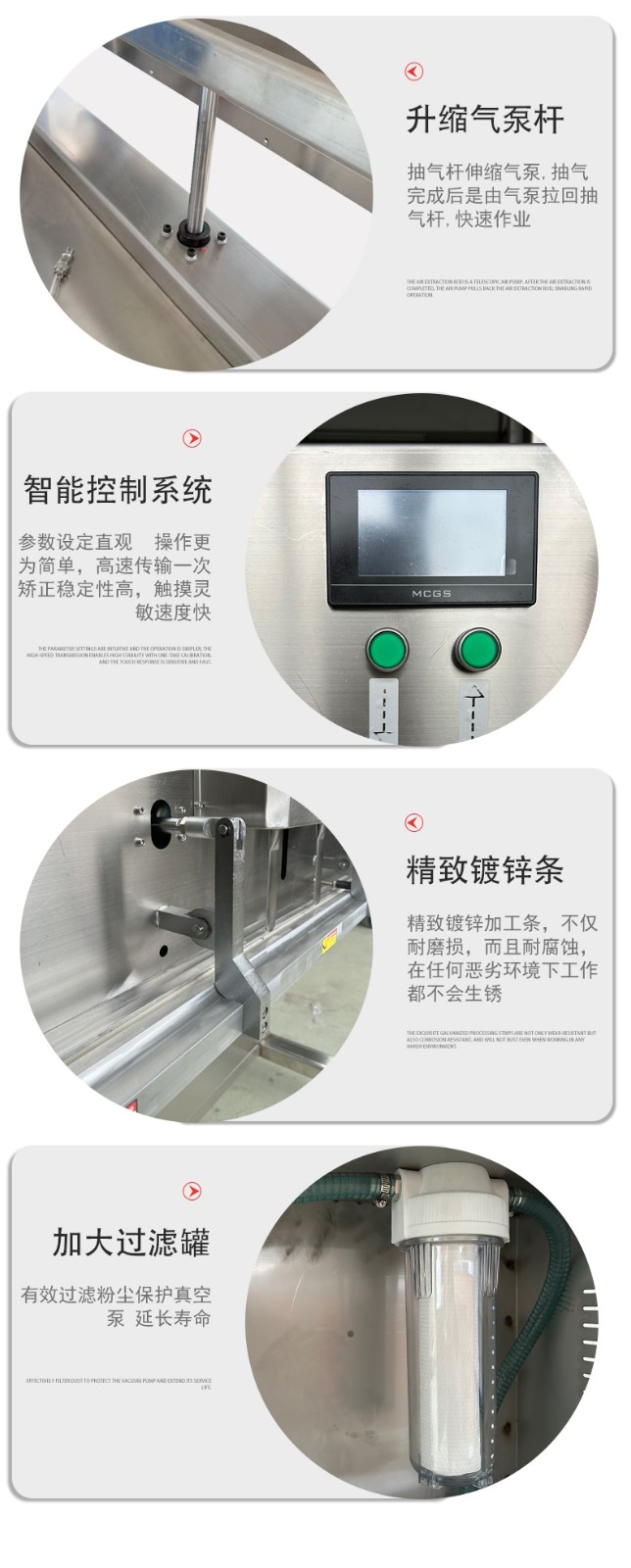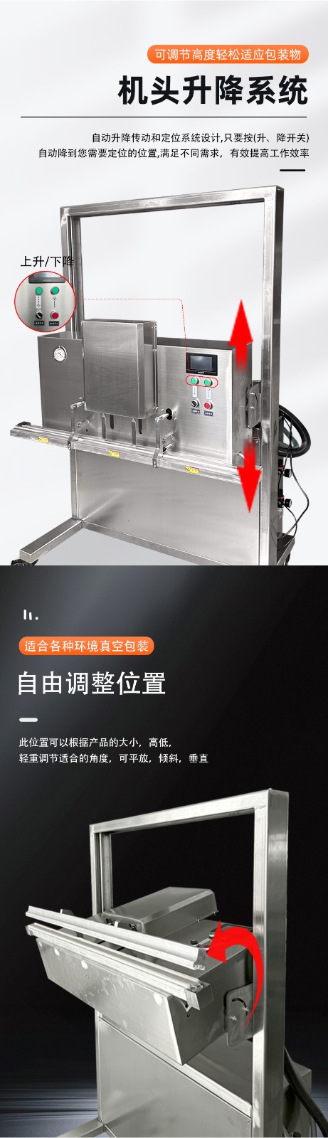 升降結(jié)構(gòu)適配不同高度:工作臺(tái)或封口部件可靈活升降,例如 BG-1200型號(hào)的立式真空包裝機(jī),封口離地高度可調(diào)節(jié);立式升降系列機(jī)型頭部可垂直無論是小袋零食,還是 50kg 的大袋大米、塑膠料,都能找到適配的包裝高度。