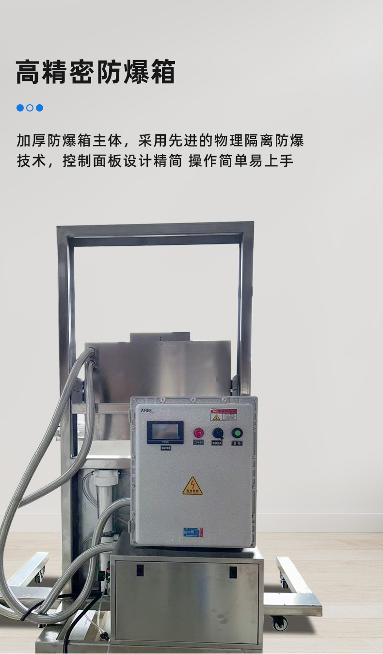 - 電氣與控制部件:整機(jī)選用防爆電器元件,像防爆型電控箱、防爆開關(guān)按鈕、防爆指示燈等,且 PLC、溫度變送器等核心控制元件均安裝在防爆箱體內(nèi),避免元件工作產(chǎn)生的電火花引發(fā)危險;電路連接采用防爆線管和防爆接頭,防止線路接口處出現(xiàn)漏電或火花外泄的情況;同時部分機(jī)型用直流 24V 無觸點固態(tài)繼電器控制,進(jìn)一步減少觸點火花風(fēng)險。