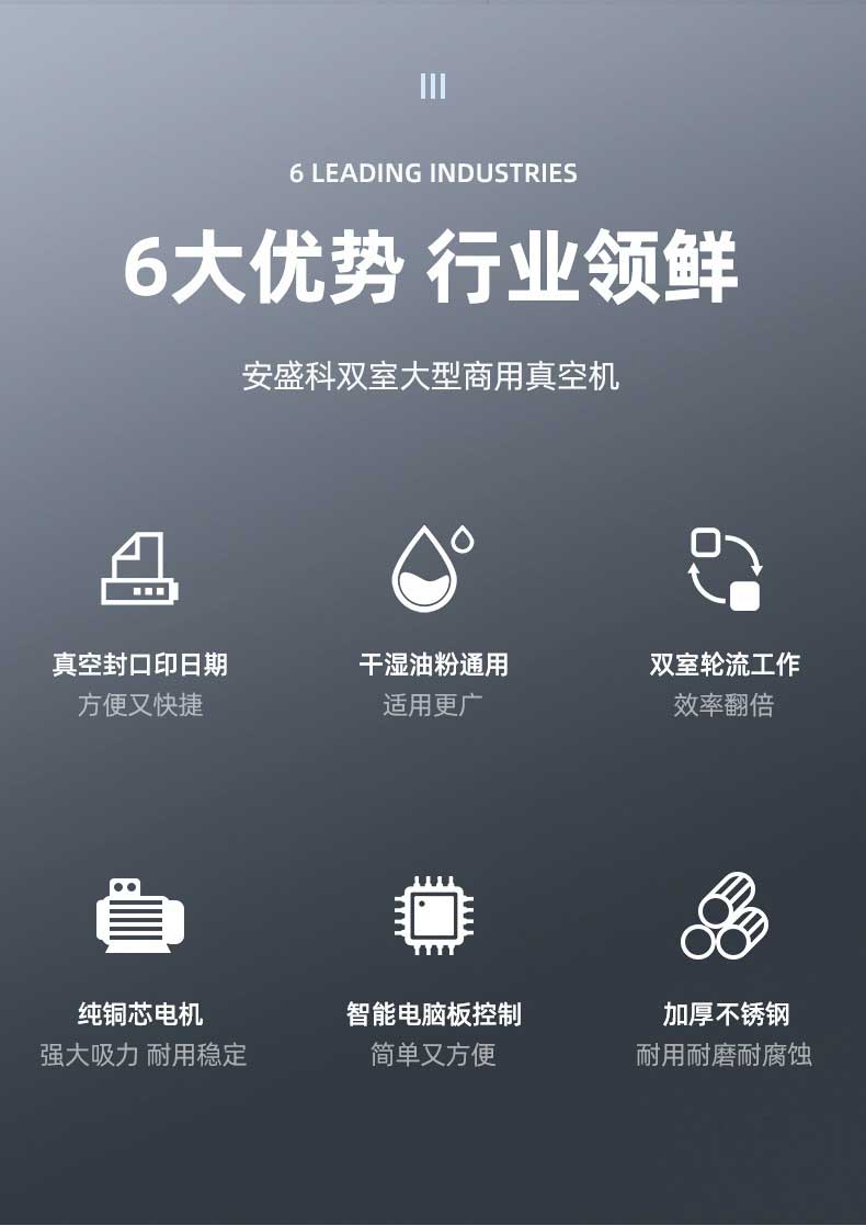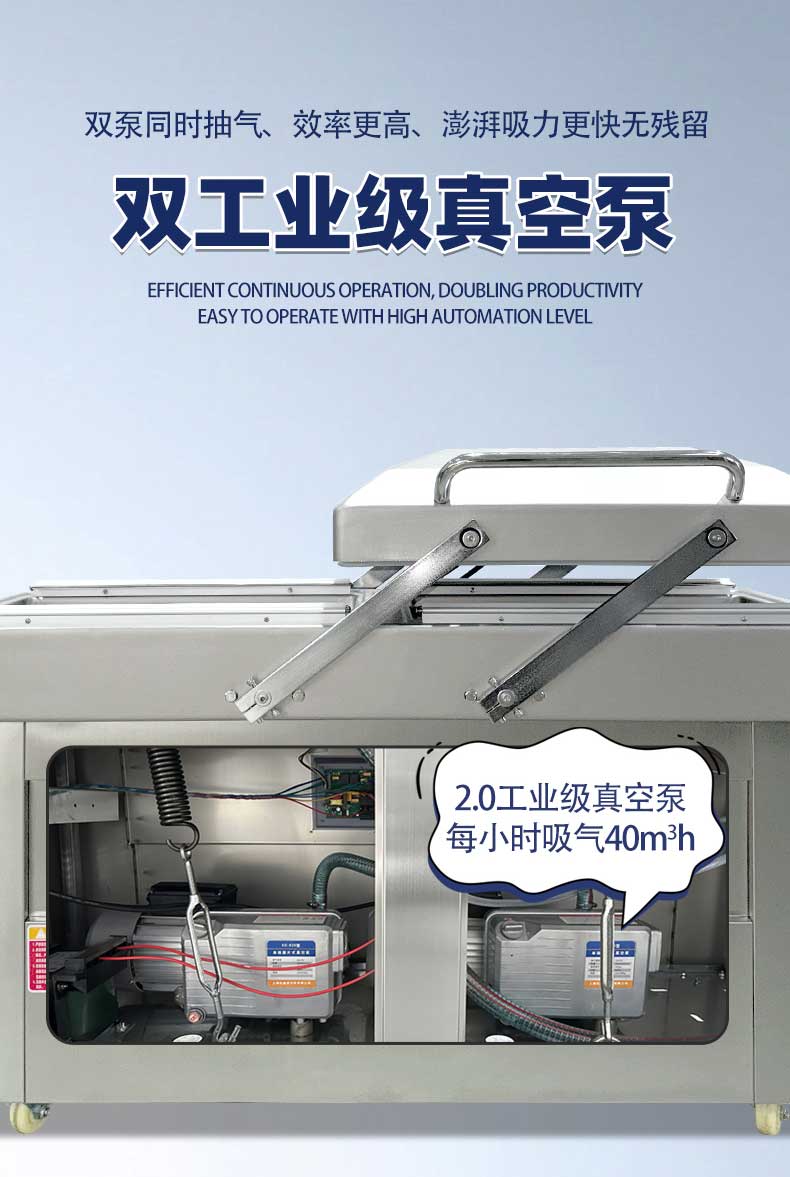 雙室結構是設備的效率核心——兩個真空室通過微電腦程序控制實現交替運作,當左側真空室完成抽氣、封口、冷卻的全流程時,右側真空室已完成物料擺放待命,真正實現“不停機連續工作”。搭配上海知名品牌大功率真空泵,雙泵獨立運作抽氣速率可達2×20m3/h,單室機每小時最多包裝160次。