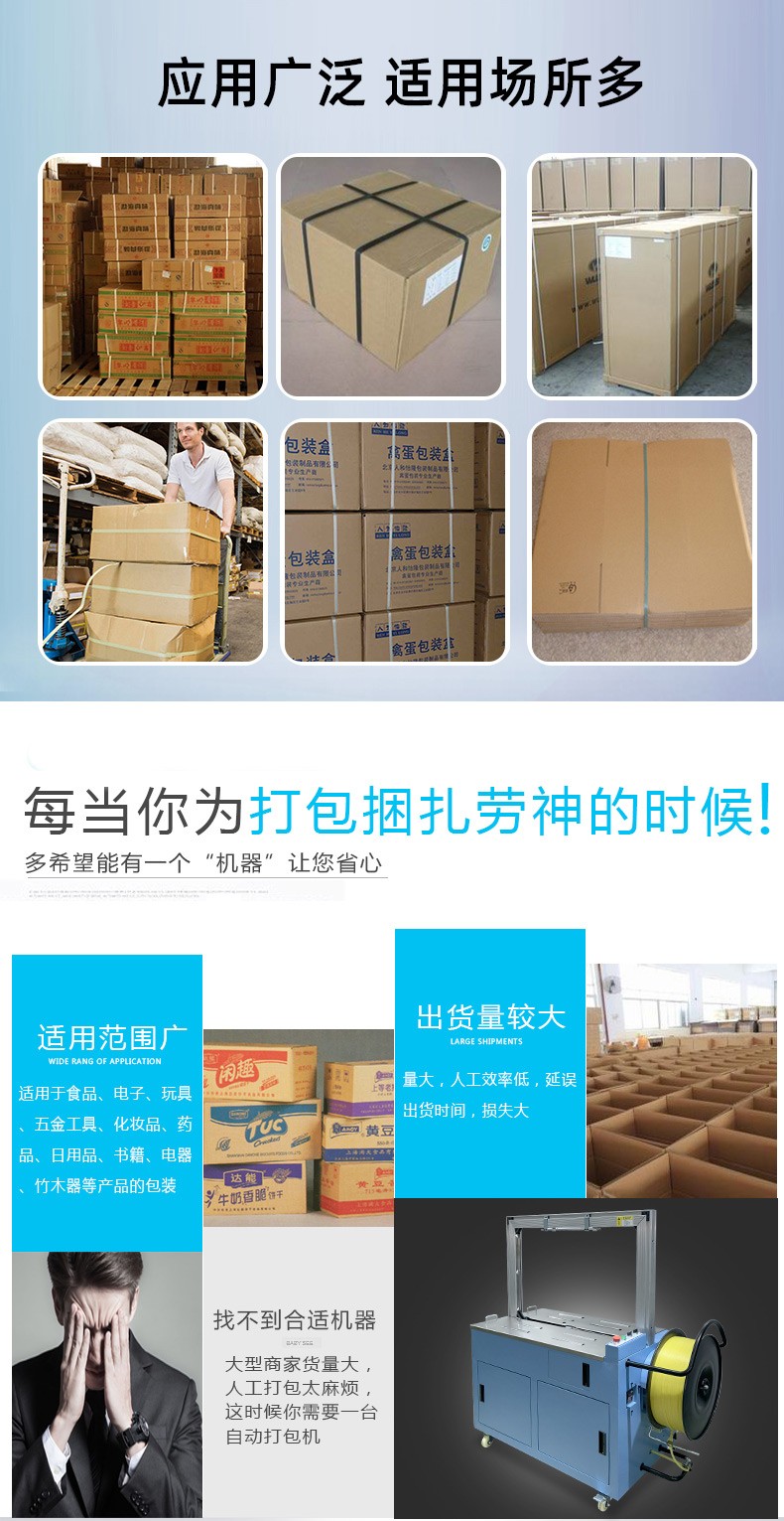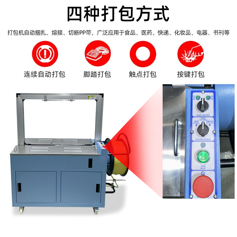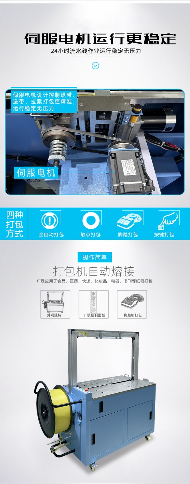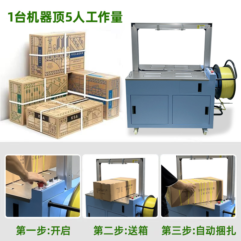 • 伺服打包機搭載伺服電機,可精準控制打包帶的張力、送帶長度和捆扎位置,誤差能控制在毫米級,適配不同規格、材質的包裝件,避免過緊壓損產品或過松導致松散。