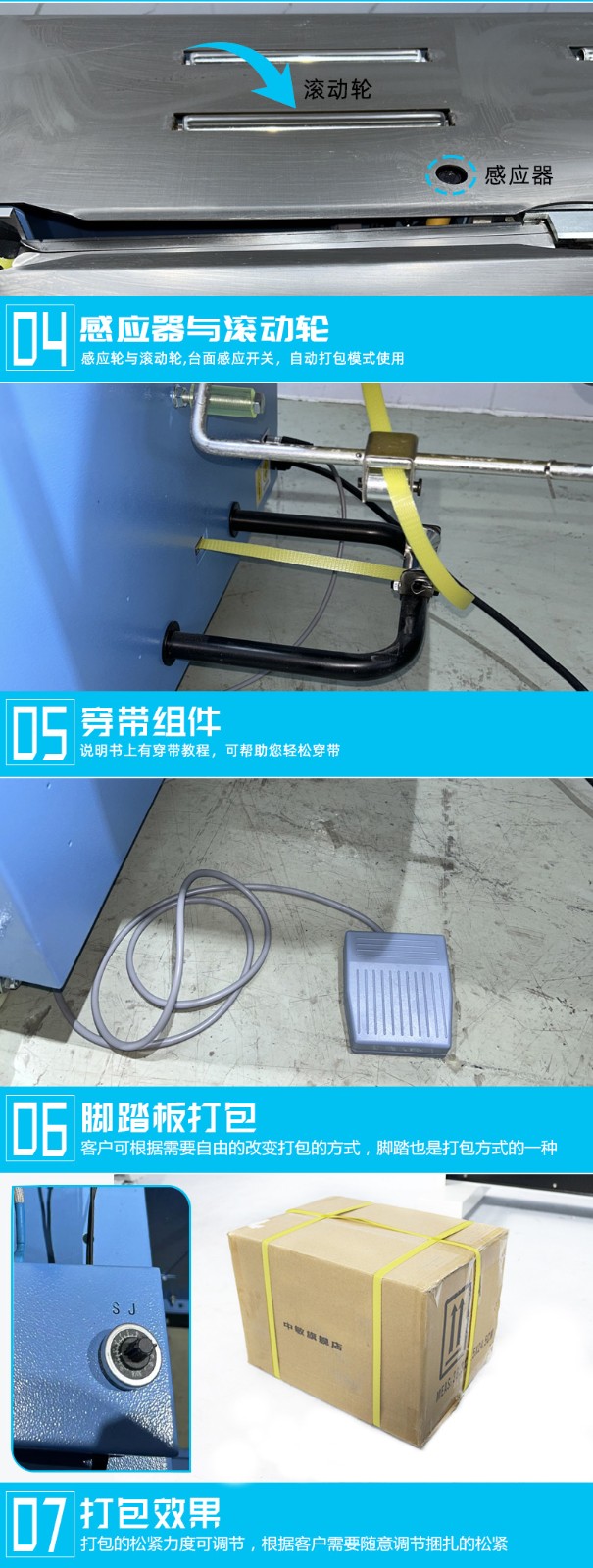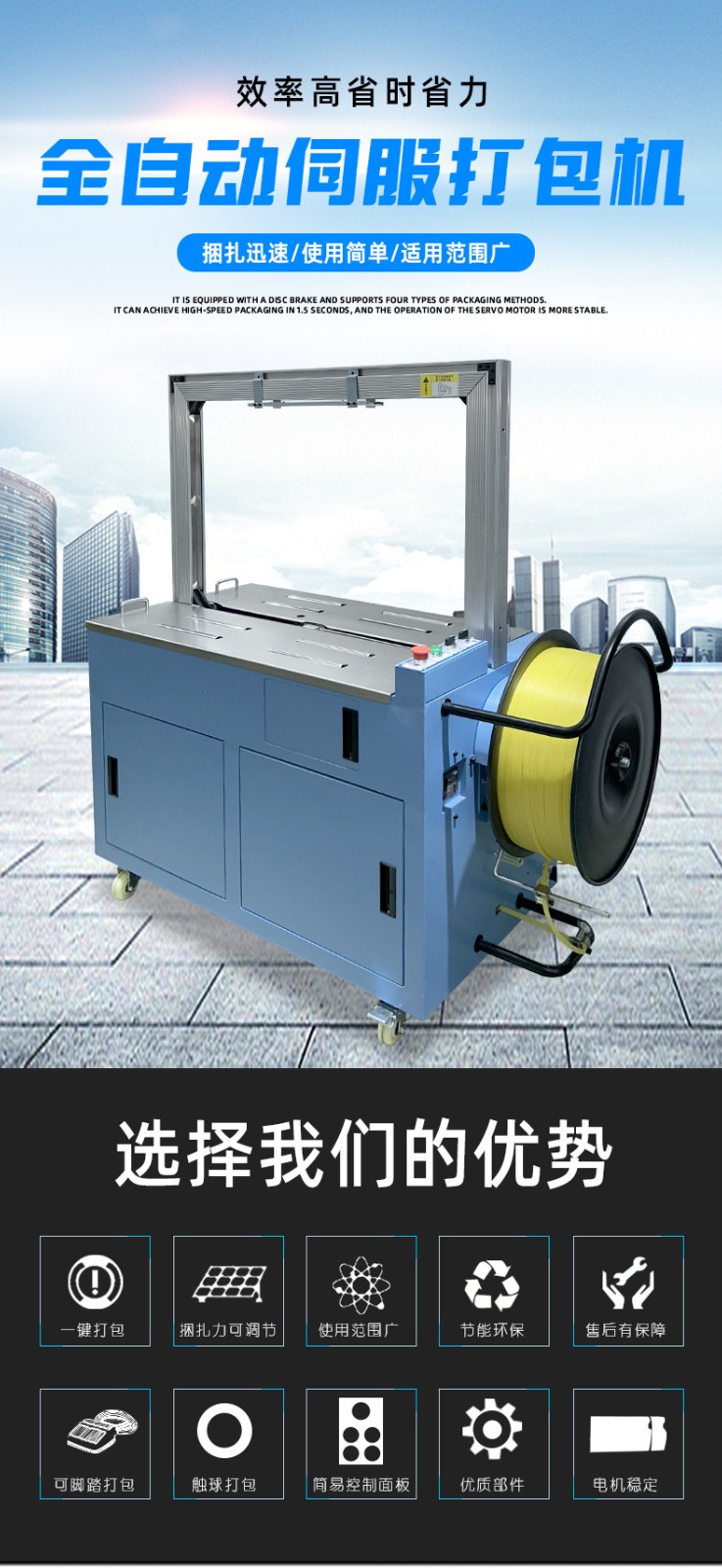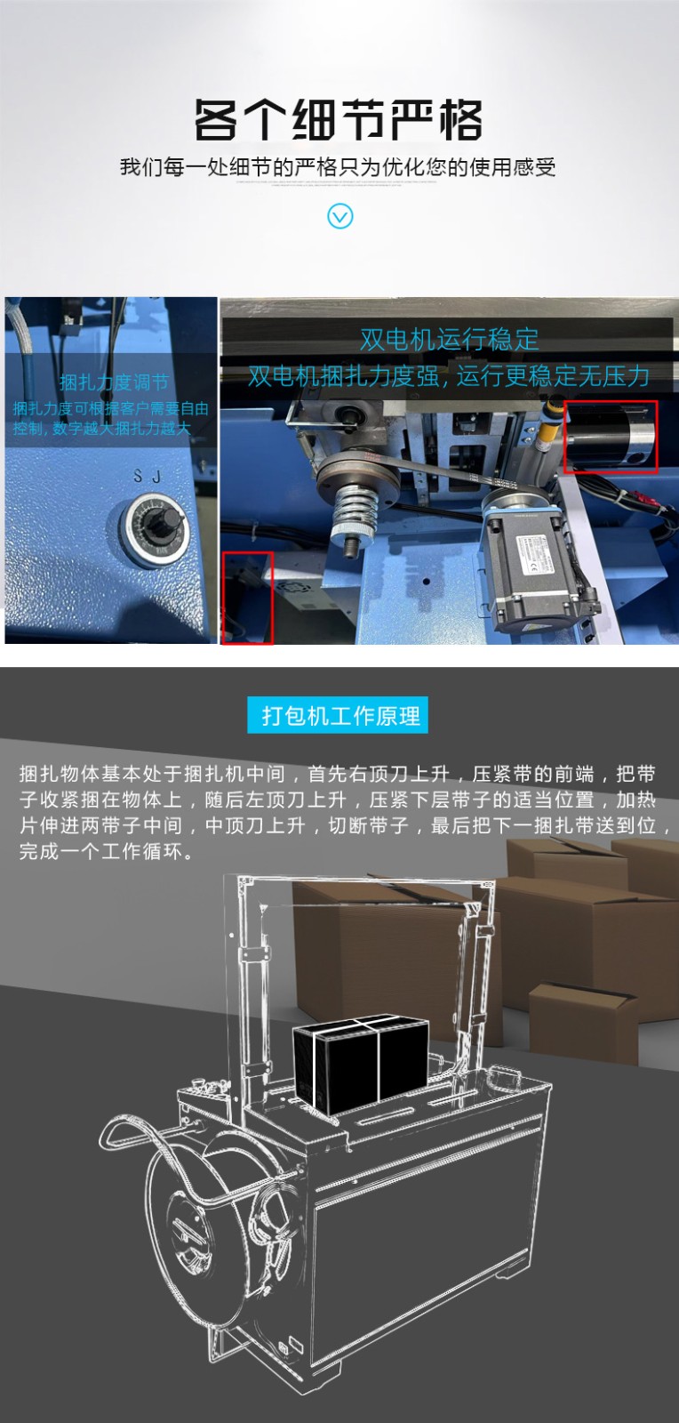 • 伺服打包機搭載伺服電機,可精準控制打包帶的張力、送帶長度和捆扎位置,誤差能控制在毫米級,適配不同規格、材質的包裝件,避免過緊壓損產品或過松導致松散。