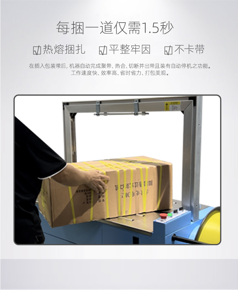 • 伺服電機可按需調節送帶長度,避免多余耗材浪費,同時精準控制熔接溫度和時間,打包帶接頭牢固度高,減少因接頭斷裂導致的重復打包,能降低 10% - 15% 的打包帶損耗。