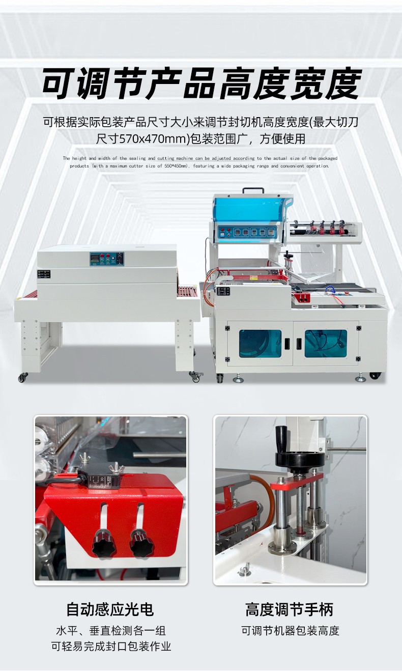 • 設備可通過調節 “輸送帶速度、封切溫度、收縮溫度”,適配不同尺寸產品(通常適用產品尺寸:長 50-600mm、寬 30-400mm、高 20-300mm),從小件(如口紅、藥盒)到中件(如禮盒、小家電)均可包裝。