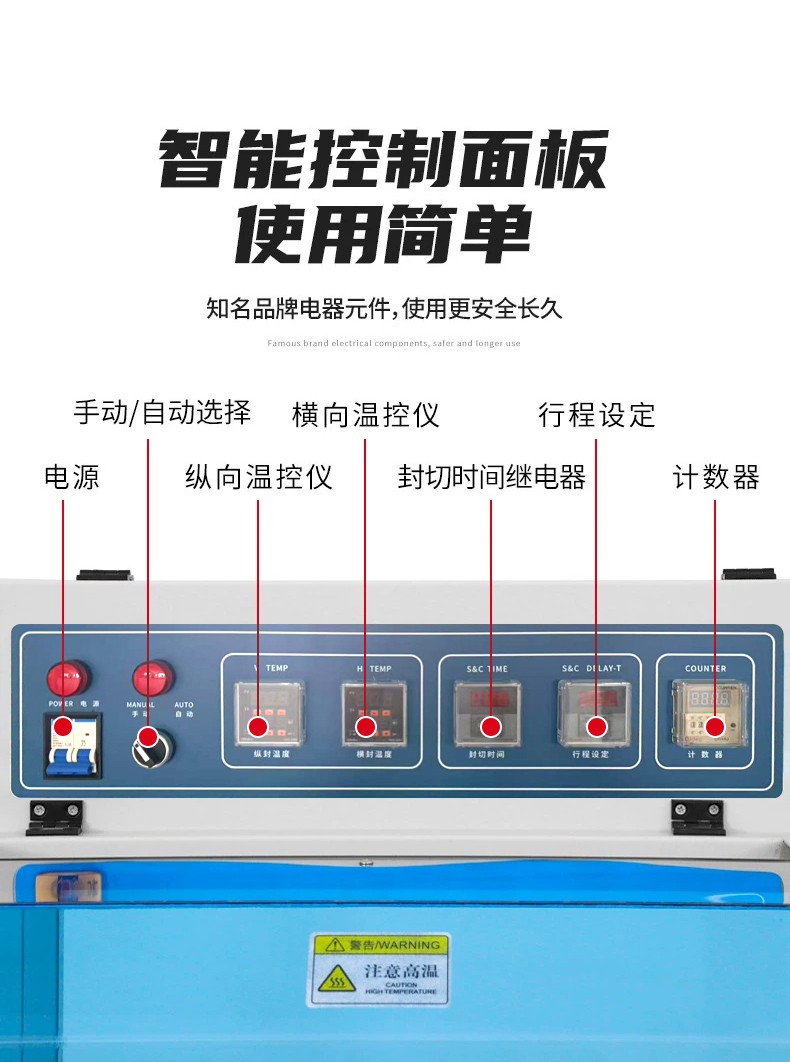 4. 電控單元PLC 控制系統、觸摸屏、急停按鈕、溫控儀自動化控制核心:觸摸屏設定參數(速度、溫度、封切時間),PLC 協調各單元動作,溫控儀精準控溫