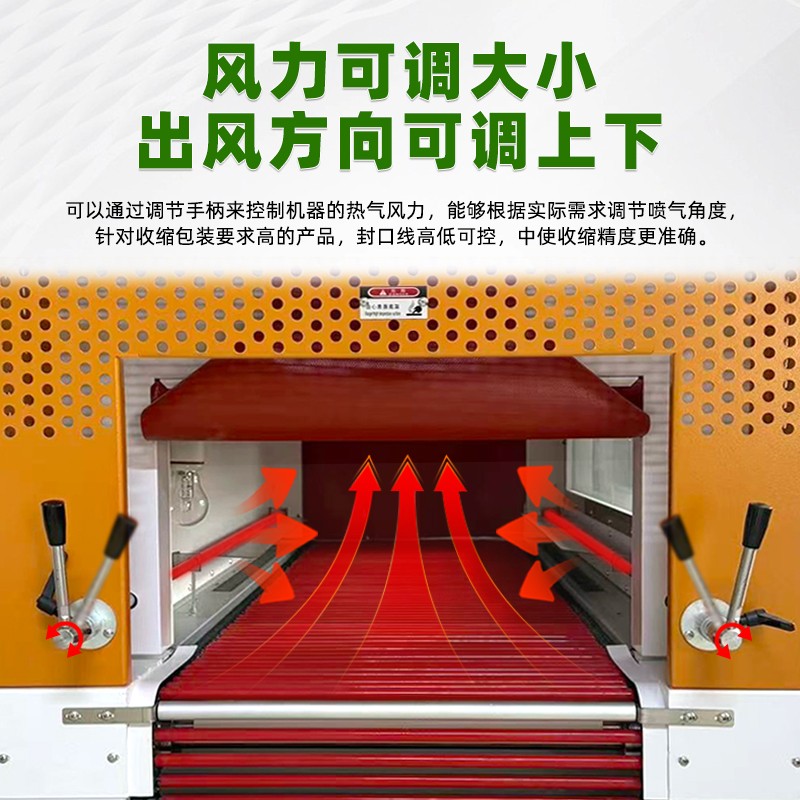 - 輸送系統穩定:輸送采用新型輥軸,外套進口纖維套管或耐高溫硅膠管,具有耐高溫、耐磨損、不燙膜、不變形等特點,可長久使用,且輥軸可選擇轉動或不轉動,以滿足不同產品的收縮要求。